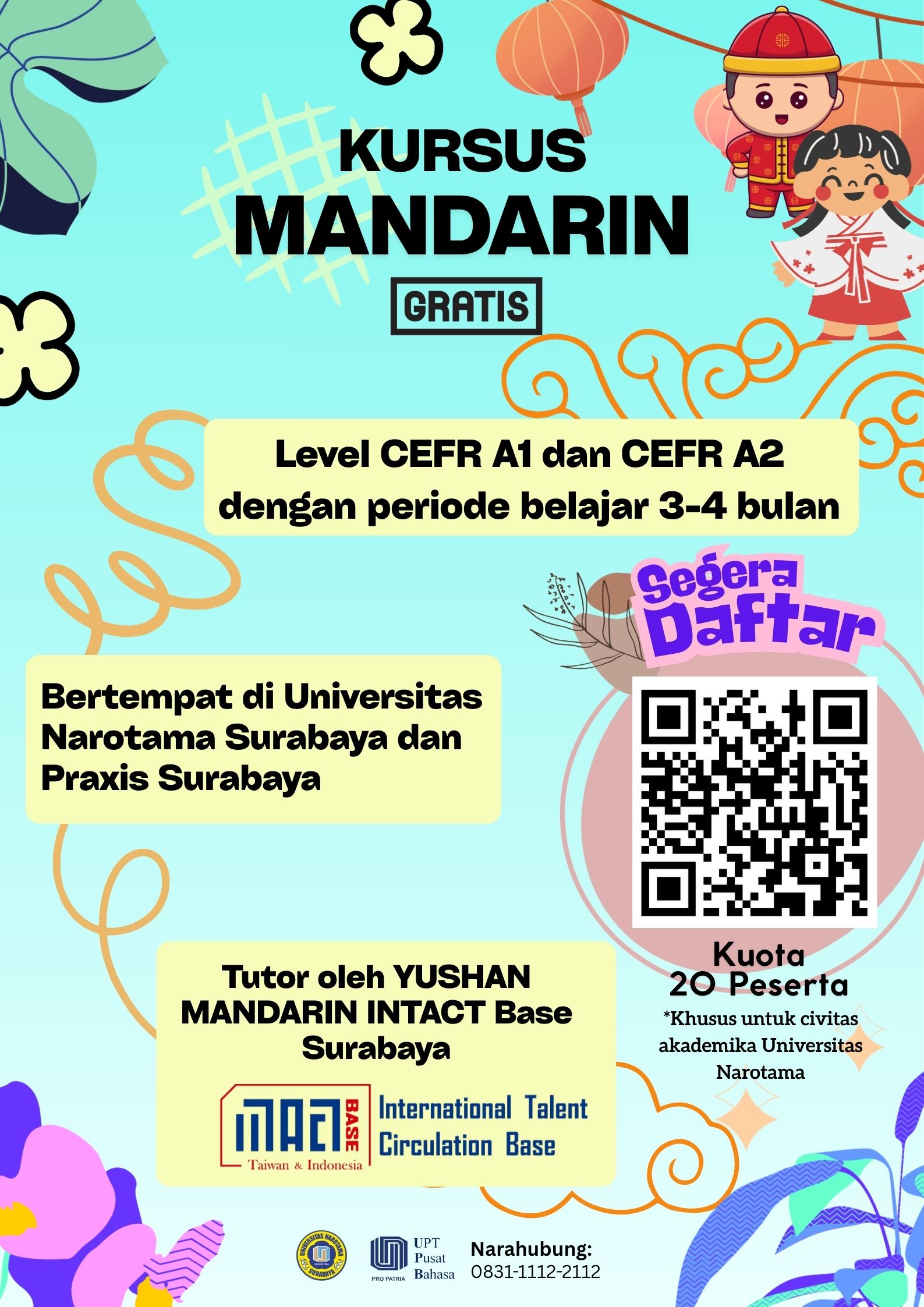 Dalam rangka meningkatkan kompetensi dan membekali keterampilan bahasa asing, Universitas Narotama bekerja sama dengan YUSHAN MANDARIN INTACT Base Surabaya membuka program “Kursus Bahasa Mandarin Gratis” untuk level pemula. Program ini merupakan kesempatan emas bagi Civitas Akademika Universitas Narotama untuk mempelajari baha........